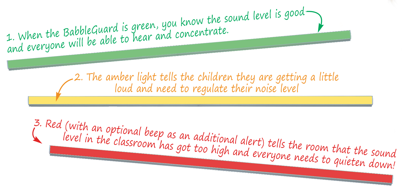 The BabbleGuard can be used by teachers as part of general classroom discipline to encourage children to self-regulate their noise level. Good classroom acoustics are crucial for a pupil's ability to hear, listen and learn.