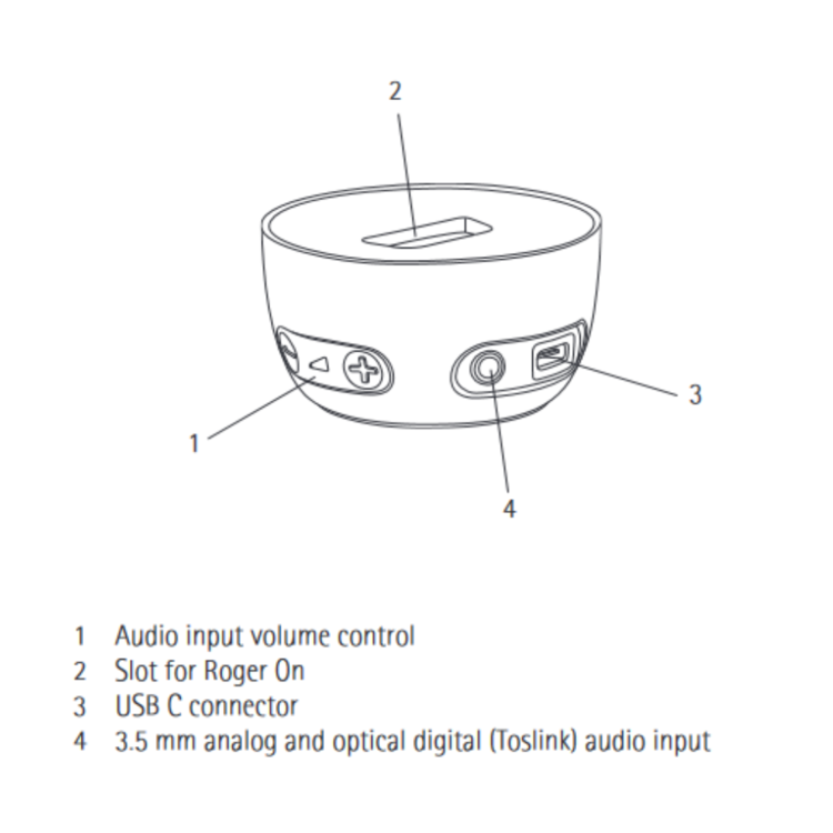The Roger On docking station is used to both recharge the microphone and transmit audio from a TV or other audio device (such as your TV, computer or tablet) to the Roger Select (and into your hearing aids). The docking station accepts both analogue and digital audio (Toslink) inputs.