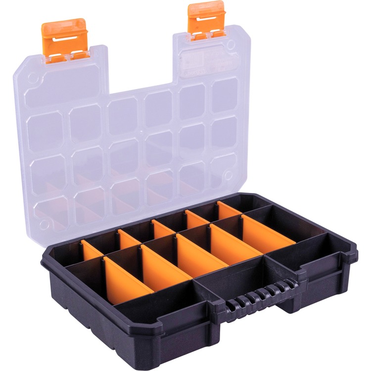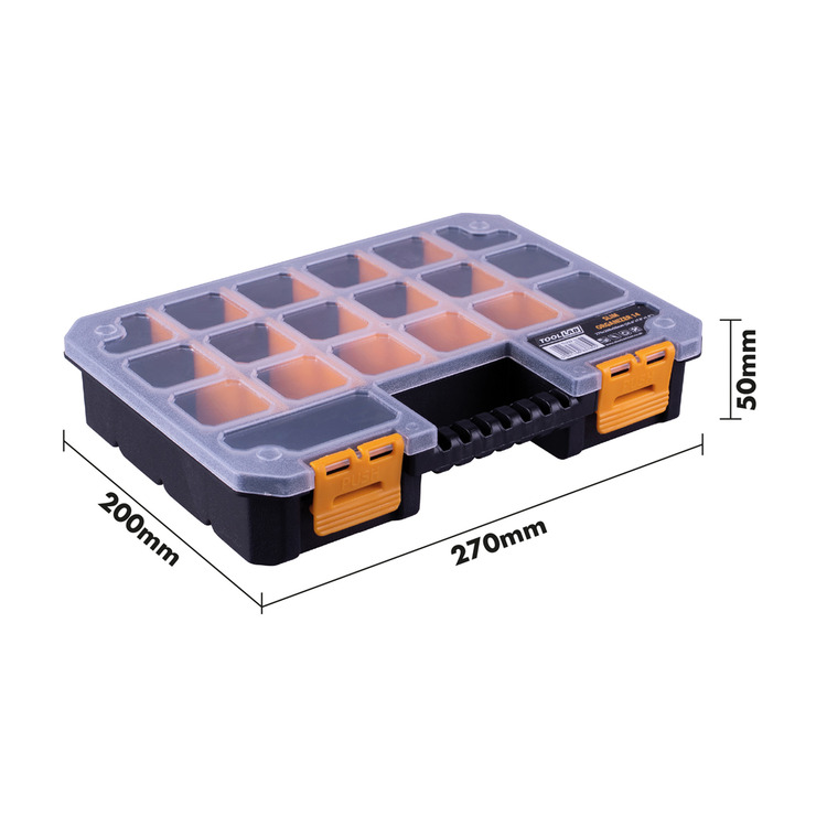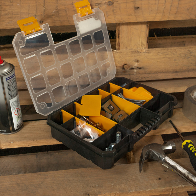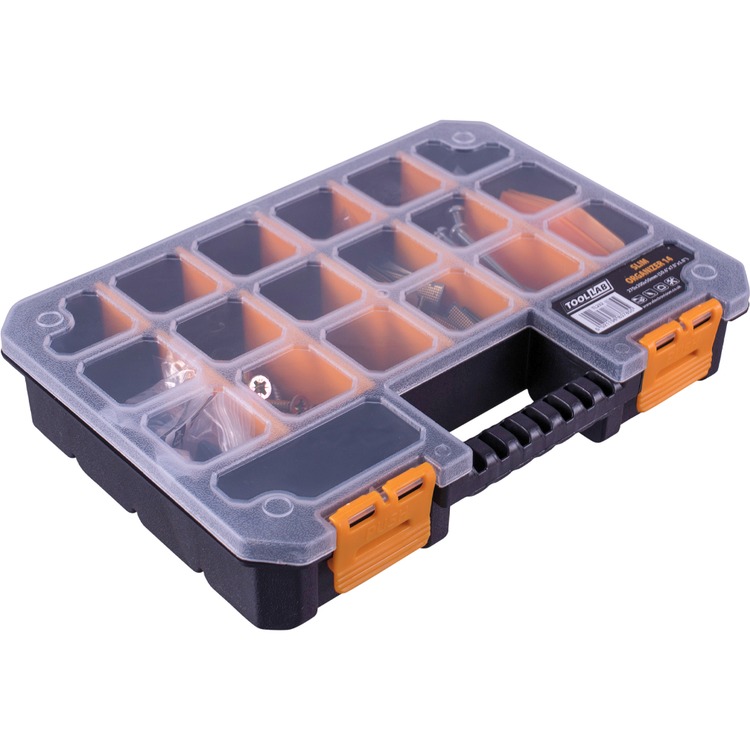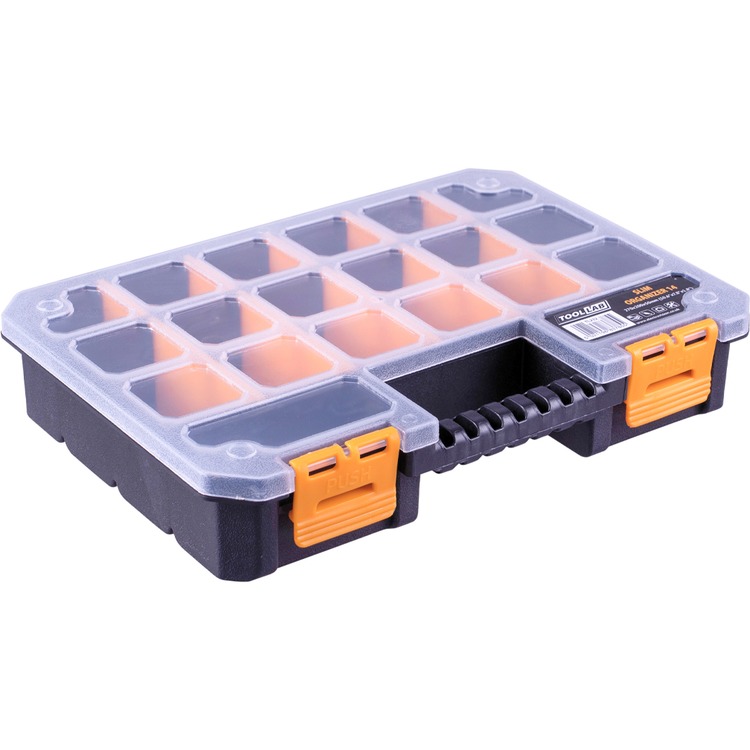 The ToolLab 14 Compartment Slim Organiser Box with Clear Lid Perfect for Storing Small Components is a slim organiser box perfect for storing your DIY essentials and small parts easily and securely.