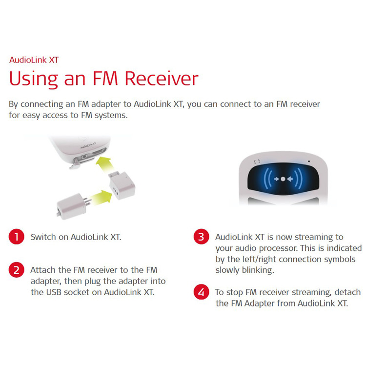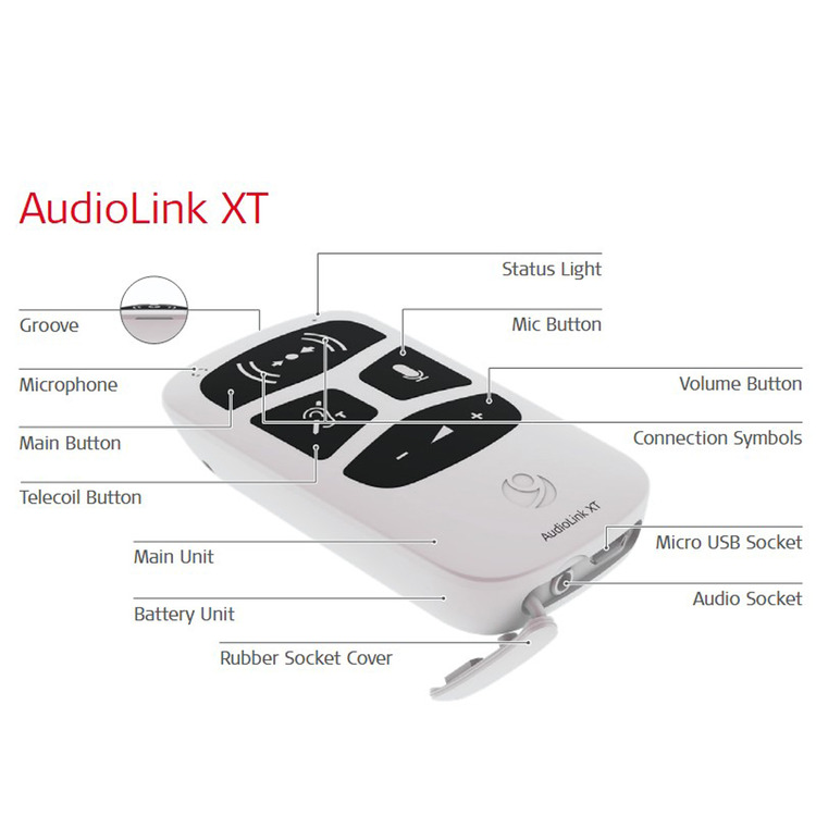 A World of Connectivity Options. Continue using all your favourite connectivity systems. Via AudioLink XT’s built-in telecoil, you can connect to wireless systems, hearing loops, and Bluetooth® neckloops. You can also access direct audio input, for example, to connect to your laptop or desktop to listen to music or other audio. Alternatively you can use the FM adapter to connect to FM systems.