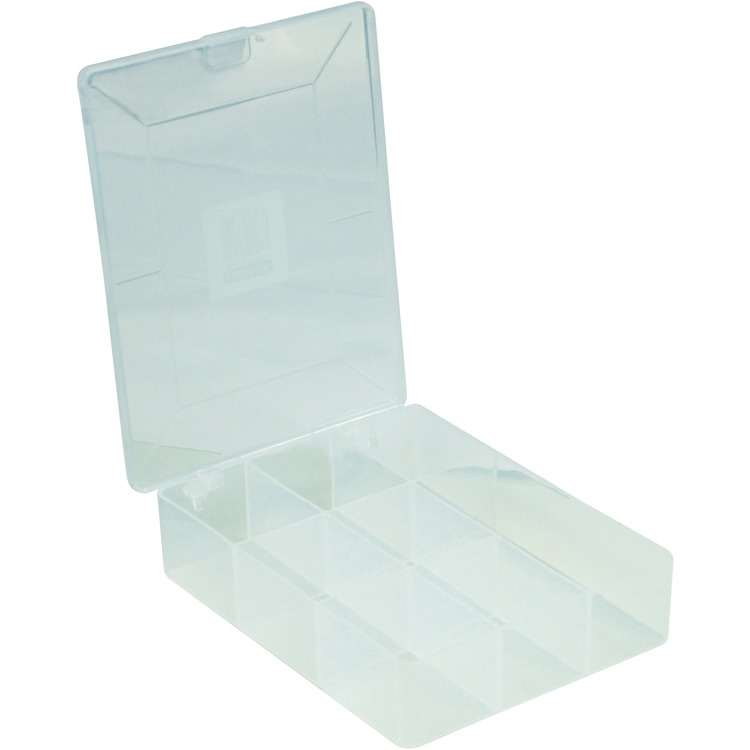 Strongly constructed polypropylene compartment storage boxes with hinged lid. Semi-transparent finish.